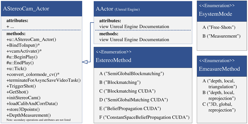 The implementation within the Unreal Engine makes use of the methods and attributes of two classes. On the one hand, the class “AStereoCam_Actor” of the Actor plays a role. It is created when the C++ class of the type Actor is created. It contains the predefined elements mentioned above. On the other hand, it contains the methods and attributes relevant for the stereo camera model. In addition, there are some enumerations to set up drop-down menus in the Unreal Editor. The corresponding UML class diagram can be found in Figure 9.
