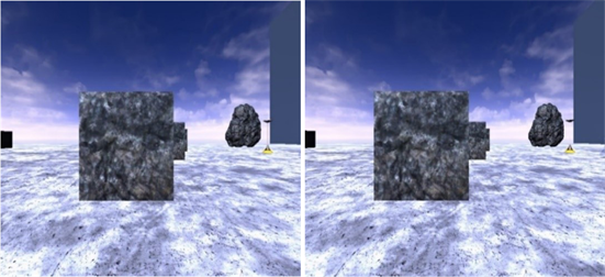 After initialisation, the iterative execution of the free-shots procedure or the measurement procedure begins. The recordings generated by the USceneCaptureComponent2D are read out and are then available for the selected operating mode. The process does not generate the recordings of both virtual camera modules exactly at the same time, but sequentially and immediately one after the other. In the present case, this does not lead to errors in the evaluation, as the execution speed of the programme is sufficiently high. If the user has chosen the “mode for free-shots” before starting the simulation, the programme displays the currently captured image at each iteration using the method cv::imshow(). Methods with the prefix “cv::” come from the OpenCV library. The iterative output with cv::imshow() appears to the user like a live video. If he has selected that the programme should save the free-shots and if the desired motif has been found, the user initiates a shot by pressing a key. This is followed by the execution of the method GetShot(), which saves both stereo shots with individual file names in JPEG format on the hard disk. Such a stereo image pair is shown in Figure 11. When comparing the bottom of the virtual environment at the lower edges of the image, the disparity becomes clear.