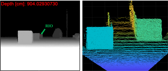 Figure 12. Disparity map with RIO and depth value (left) and 3D reconstruction (right).