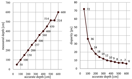 Figure 17. Depth (left) and disparity (right) measured by the model as a function of the accurate distance.