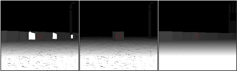 In addition to the local depth estimation, the programme also enables the estimation of the three-dimensional position of a spatial point for each pixel from the image plane for which a disparity value is available. The reprojection matrix is also used for this purpose. Since such a global 3D reconstruction is computationally expensive, it is carried out at the user’s keystroke instead of at each iteration. In the course of this, the programme saves the calculated positions on the hard disk. Figure 8 shows all three forms of depth estimation.