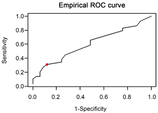 Overall, the sensitivity and specificity estimates were 0.30 (95% CI = 0.15 - 0.49) and 0.87 (95% CI = 0.70 - 0.96), respectively, leading to an Area Under Curve (AUC) estimate of 0.59 (95% CI = 0.46, 0.71) (Figure 1 and Figure 2).