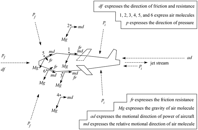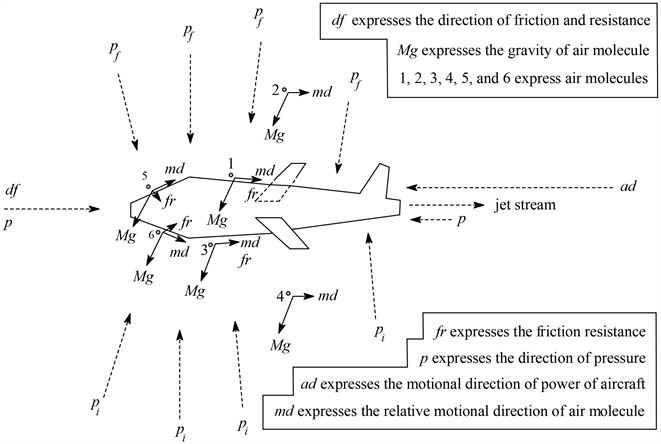 ) will increase such as the position of air molecule 6. Obviously, the atmospheric pressure of position of air molecules 3, 4, and 6 are more than those of air molecules 1, 2, and 5 at the surface of aircraft. Besides, the buoyancy will increase for the aircraft in the vertical direction of earth surface (see Figure 3), and the non-friction resistance could increase for the aircraft in the horizontal direction of earth surface (see Figure 4).