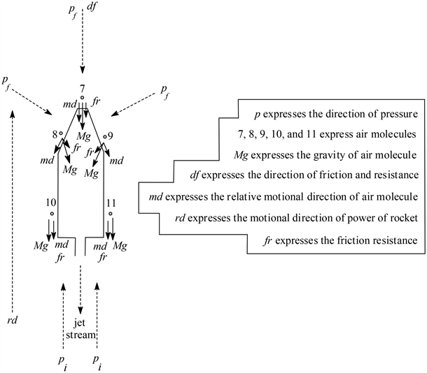 If the rocket flies or motions upward in the vertical direction of earth surface, the friction will decrease, and the atmospheric pressure will increase comparing with the corresponding origin pressure on the slope of ahead part of rocket surface such as the position of air molecules 7, 8, and 9 (see Figure 5).