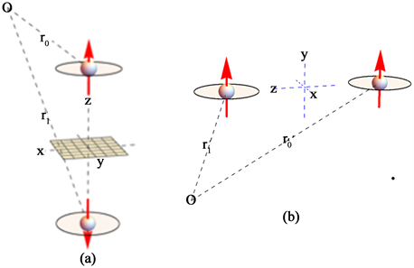 Figure 1. (a) Two coaxial anti-parallel momenta move apart from a reconnection event at the origin. The momenta are represented by red arrows, the local field mass density by the sphere on the red arrow, and the local field circulation by the disc surrounding the sphere. The xy-plane defines the region where induced fields cancel each other. (b) Two parallel momenta, with accompanying induced C-field circulations, interact with respect to observation point O.