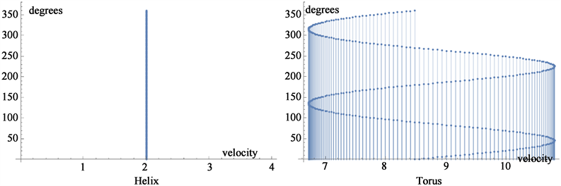 The speed at any point on the helix is constant as is shown in Figure 4(a). Our U(1) × U(1) conceptual model shows every circle disconnected from every other circle; not a helix. To reflect the physical ontology of the torus, we desire helical flow lines. The tangent, and hence flow velocity, has the same definition, and since the radius is constant around the U(1) circle, the velocity is constant. The parametric helix is