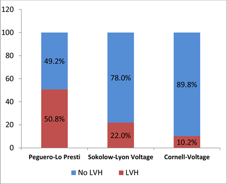 This figure shows that the frequency of LVH was 50.8% for Peguero-L Presti, 22% for Sokolow Lyon Voltage and 10.2% for Cornell voltage. This fréquence was significantly higher using the Peguero-Lo Presti index compared to the Sokolow-Lyon and Cornell index (p < 0.001) (Figure 3).