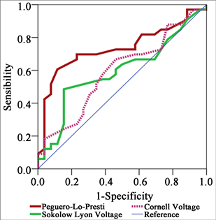 To improve the diagnostic accuracy of the Peguero-Lo Presti index, the area under the curve and the maximum Youden index were also calculated, this showed that the Peguero-Lo Presti index had values of the area under the ROC curve and higher Youden index than Sokolow-Lyon and Cornell-Voltage. These data are consistent with data reported by several Western studies [23] [24] .
