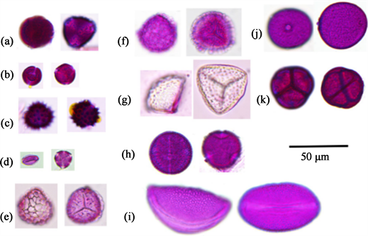 The review and photography of the pollen grains was carried out with an OMAX® Microscope, an OMAX® 18 MP camera, and a slide micrometer. Grains were captured in polar and equatorial position at 40× magnification.