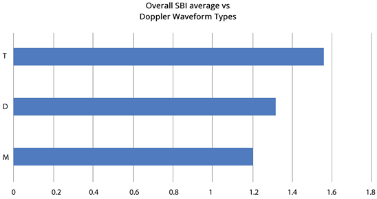 The patients with a vascular color Doppler monophasic waveform had an SBI average of 1.20, those with a biphasic waveform had an SBI average of 1.29, and those with a triphasic waveform had an SBI average of 1.57 (Figure 10).
