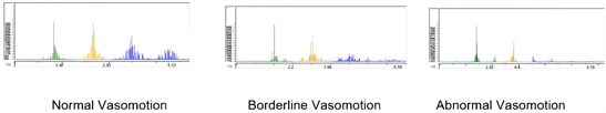 Figure 3. Screen shot of the PTG Index types. The PTG spectral analysis marker, called the PTG Index is calculated from the amplitude of the vasomotion of the spectral analysis. The less vasomotion seen in the graphic is indicated by a lower PTG Index value expressed in Volts per second (V/s) units.