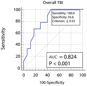 The overall TBI gave a specificity of 55.6% and sensitivity of 100%, with a cutoff ≤ 0.55. (P = 0.001 and AUC = 0.824) for detecting vascular color Doppler ultrasound biphasic and monophasic waveforms versus triphasic waveforms (Figure 7).