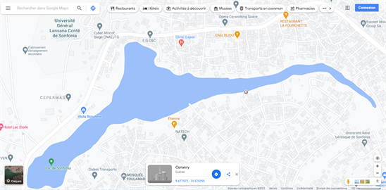 Lake Sonfonia is located near the suburbs of Foulamadina and Sonfonia, the landmarks general university lansana county of Conakry, the Blue zone of sonfonia. The length of Lake Sonfonia is about 2.5 km and 100 to 200 m wide in places. The depth varies between 6 to 7 meters in the rainy season and between 3 to 4 meters in the dry season. The lake is fed by a natural source of groundwater, it houses the drinking water treatment point of the SEG (Figure 1 and Figure 2).