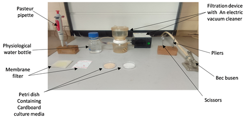 The 250 ml water sample to be analyzed was diluted successively: (dilution factor 1/10, 1/100 and 1/1000). 100 ml of water was filtered through a membrane filter (0.45 micron; dark green gridded green) or (0.45 micron; black grid white).