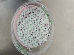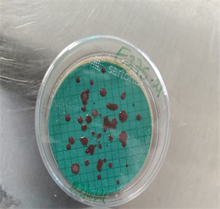 Figure 5. A petri dish containing Azide culture medium on a green background for the isolation of faecal streptococci.