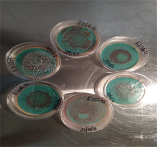 Figure 6. Six petri dishes containing the Azide culture medium on a green background corresponding to the water samples taken at the various stations for the isolation of faecal streptococci.