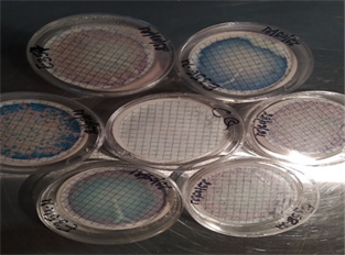 The enumeration of the germs sought was done by the membrane filter technique and the culture of the germs was carried out on cardboard culture media (NKS) (see Figure 4: filtration device with aspirator and culture media on cardboard). The following culture media were used for sprout incubation: Azide for faecal streptococcal (SF) (Figure 5 and Figure 6); isolation Chromocult for the isolation of Total Coliforms (TC), Fecal Coliforms (CF) and Escherichia coli (E. coli) (Figure 7 and Figure 8) and finally Bismuth Sulfite for the isolation of Salmonella.