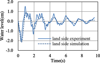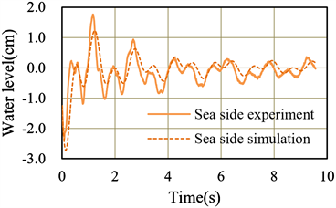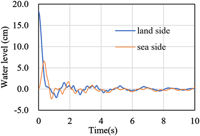 amphibious chambers both oscillate and gradually decay. In the mode decomposition described below and the numerical modelling described in the next section, the data from 0.75 s, when the water level on the landward side first drops below 0 cm, were used as experimental data (Figure 8).