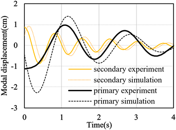 . The experimental values in Figure 13 are identical to the time series of the primary and secondary modes shown in Figure 9. The figures show that the primary mode has a large difference at the first wave, but after that the waveforms agrees well, while the secondary mode shows constant agreement of amplitude and decay characteristics between simulation and experiment.