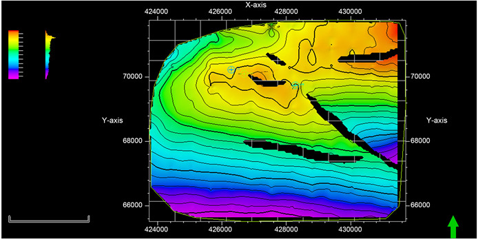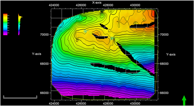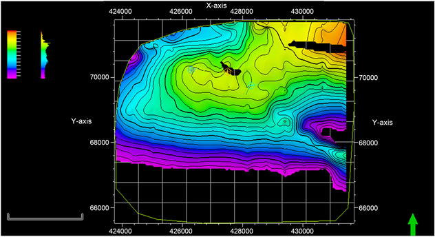 Horizons and faults were identified and mapped as part of the seismic data interpretation. Through seismic to well tie, the reservoir sands identified on the well-logs were traced on the seismic sections. On the seismic sections, this was done to outline the exact position, lateral extent, and shape of the reservoirs. On the inline and crossline seismic sections, the reservoir tops and bottoms on the logs were traced. On the base map, the times that corresponded to the horizons were chosen and posted. Fault interpretation, horizon interpretation, and finally seismic structural maps were constructed to analyze the geometry of the mapped horizons employed for seismic data interpretation. This was done in order to locate structural traps or closures around fault blocks.