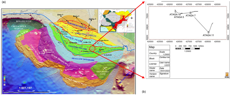 Figure 1. Location of the study area (a) Niger Delta structural framework [6] showing the study area (b) location of the wells generated from petrel map windows.