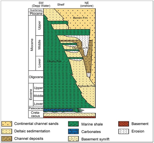 The Akata, Agbada and Benin Formations lithostratigraphic units (Figure 2) have been defined as the subsurface stratigraphy of the Niger Delta with its ages decreasing basinward that is, from Eocene to Pleistocene times and corresponds to Northern-Offshore depobelts which reflect an overall regressive or shoaling sequence. Generally, the formations are coarsening-upward progradational clastic deposited in marine and non-marine environments [9] [10] . The age of Akata Formation has been reported between Paleocene to Recent and its lithologies composed of shale and silts with streaks of turbidites sand [9] [10] . These shales were deposited during the early stages of Niger Delta progradation and where exposed onshore are designated as Imo Shale.