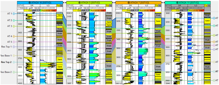 Figure 5. (a) Well correlations showing the facies log; (b) Well correlation showing reservoir AT1 and AT2 on well Ataga 10 and Ataga 5.