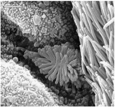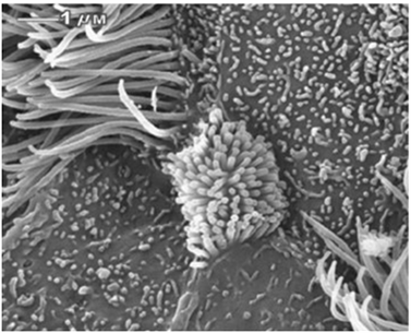 Figure 9. Original description (SEM) Rat bronchial epithelium exposed to 2160 h of continuous ILFN. A BC is in the centre of the image. Its microvilli are not sprouting upward and, instead, have fused, forming a central indentation that seems to be spreading outward. The prominent SC that surround the BC are swollen forming deep valleys at the intercellular junctions. SC microvilli are very irregular. Ciliary vesicles are visible. Ultrastructure micrographs, obtained with scanning (SEM) and transmission (TEM electron microscopy. BC (brush cells), SC (Secretory cells). Rat bronchial epithelium, exposed to 2160 h of continuous IFLN.