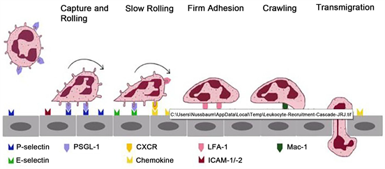 Figure 1. Original description: Schematic overview of the leukocyte recruitment cascade using the example of a neutrophil leaving a postcapillary venule. Capture and rolling are mediated by interaction of selectins with PSGL-1 on the neutrophil surface. During rolling, the neutrophil is activated by chemokines presented on inflamed endothelium leading to firm adhesion through binding of neutrophil integrins (LFA-1 and Mac-1) to endothelial adhesion molecules (e.g., ICAM-1 and -2). Upon firm adhesion, the neutrophil spreads and begins to crawl along the endothelial lining in search of an appropriate site for transmigration. States of leucocytes diapedesis: Capture and rolling, Slow rolling, Firm adhesion, Crawling, Transmigration Original source [19] Nussbaum, C., Sperando, M. (2011): Innate immune cell recruitment in the foetus and neonate. J Reproduction. Immunol 2011; 90(1): 74-81. (IF 2, 966). Page 2 FIG 1 With permission.