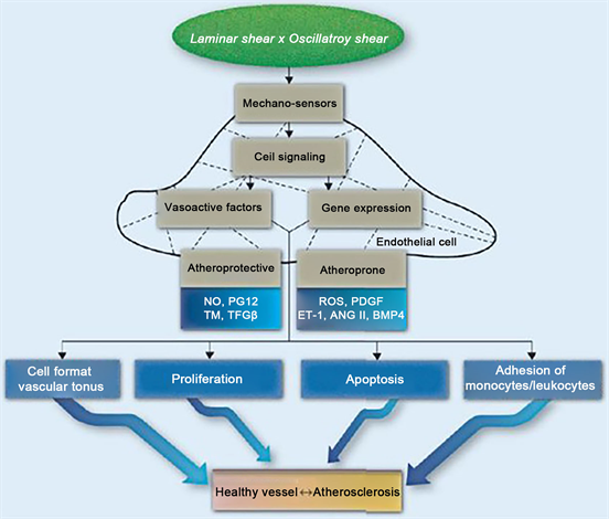 Figure 2. Original description: Different effects of laminar and oscillatory shear on cell function and atherosclerosis. The dotted lines represent the endothelial cell cytoskeleton. Laminar and oscillatory shear forces are recognized in endothelial cells by mechanosensors and the mechanosignals initiate signalling cascades that regulate the production of vasoactive factors, and the balance between these factors. While laminar shear stimulates the production of atheroprotective factors, oscillatory shear stimulates the production of atherogenic factors and the balance of these factors determines the vessel tendency to stay healthy or to develop atherogenic plaques. PGI2, prostacyclin; TM, thrombomodulin; TGFb, Transforming Growth Factor beta; PDGF, Platelet-Derived Growth Factor; ET-1, Endothelin-1; BMP4, Bone Morphogenetic Protein 4. Adapted from Jo H, Song H, Mowbray A. Role of NADPH oxidases in disturbed flow- and BMP4-induced inflammation and atherosclerosis. Antioxid Redox Signal 2006; 8: 1609-19. Overview over the different effects of laminar and oscillatory shear stress on cell function and atherosclerosis. Original source [3] Fernandes CD, Araujo Thaı’s S, Laurindo FRM, Tanaka LY. Hemodynamic Forces in the Endothelium. Mechanotransduction to Implications on Development of Atherosclerosis. In: ENDOTHELIUM AND CARDIOVASCULAR DISEASES. Vascular Biology and Clinical Syndromes. Edited by PROTASIO L. DA LUZ.PETER LIBBY ANTONIO C. P. CHAGAS. FRANCISCO R. M. LAURINDO. Publisher: Mica Haley. Sao Paolo. (2018) ISBN 978-0-12-812348-5 Cap. 7 FIG 7.3, p 90. With permission.
