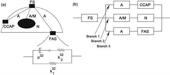 Figure 3. Original description: Schematic representation of an EC consisting of a mechanosensor (MS), cytoskeletal elements (either actin stress fibres (a) or microtubules (M)), a nucleus (N), cell-cell adhesion proteins (CCAP), and focal adhesion site (FAS). The inset shows a TPMM (or Kelvin body) representation and the viscoelastic parameters for FAS. The superscripts ‘32’ on the parameters indicate that this element is the second element on the third branch (see text). (b) Branching network representation of the EC components in panel A. Each cell component corresponds to a TPMM, coupled to other components according to the diagram shown. Actin stress fibre and CCAP connected in series are referred to as Branch 1, actin stress fibre/microtubule in series with the nucleus is Branch 2, and actin stress fibre in series with the FAS is Branch 3. (a) Schematic representation of an endothelial cell consisting of a flow-sensor (FS), cytoskeletal elements actin filament (a) or microtubules (b) and the connections (N), (CCAP), (FAS). (b) Mathematical representation. Original source [22] [30] : Temporal Network Model FIG 1 Bori Mazzag, Cecile L. M. Gouget, Yongyun Hwang and Abdul I. Barakat (2014) [22] Cap. 5. Page 98 [30] Mechanical Force Transmission via the Cytoskeleton in Vascular Endothelial Cells. In Endothelial Cytoskeleton. Editors Juan A. Rosado and Pedro C. Redondo Department of Physiology, University of Extremadura Cáceres, Spain. With permission.