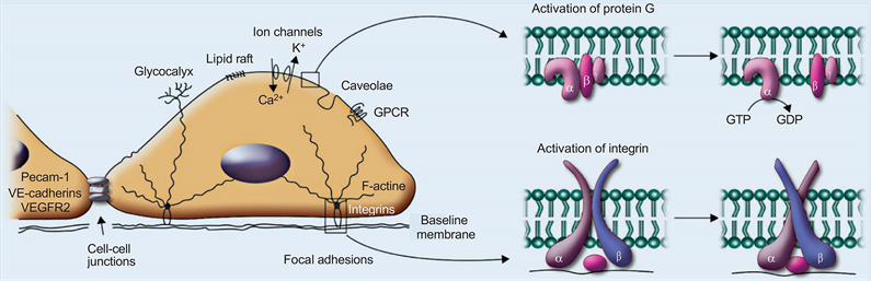 According to [3] the cytoskeleton itself is a mechano-sensor. On the side facing the vessel (luminal), mechano-sensors are especially the glycocalyx, integrins, cell-cell junctions (CCAP), caveolae, lipid rafts, G-protein coupled receptors and ion channels. They are activated according to their location via shear stress [3] (Figure 4). According to the author [3] , endothelial mechano-sensors are altered in their microenvironment by shear stress and can activate intracellular signalling pathways in this new formation. The fluidity of microdomains in the plasma membrane is altered [3] . This leads according to [3] to a spatial rearrangement of various proteins and thus to the activation of signalling pathways. The transmission of forces takes place via the three intercommunicating networks of the cytoskeleton to the basal region of cytoskeleton (e.g., Integrins) [3] [22] [30] .