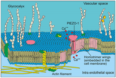 Figure 5. Schematic presentation of a PIEZO-1-channel, embedded in the endothelial cell membrane with a triggered Ca2+-inflow. The actin ring (intra-endothelial) is indicated. The wings are moved by mechanical forces on the membrane and release the channel in an opening movement. Blue/Yellow: endothelial bio membrane with lipid bilayer structure. Schematic presentation of a PIEZO-1-channel.