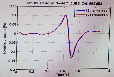 Figure 6. An infrasonic pulse extracted from the emission of a wind turbine. The fluctuations of sound pressure measurable near a wind installation usually contain noise, i.e. irregular sound events of different origin. Noise removal is possible by averaging the sound pressure over a large number of mast-blade passages (here 4100), which reveals their common element (red line). The red peak thus visualized from the time sequence coincides with the blue peak, which shows the fundamental pulse as reconstituted in the frequency domain from 15 (very sharp) harmonic lines by Fourier analysis. The result is the coherent fundamental peak of this turbine of 0.9 Hz frequency, accordant to 1.08 seconds required per blade passage. Extracted infrasonic pulse of a wind turbine showing the relation between sound pressure (P) and time (s). Original source [46] corresponding to Figure 7 Vanderkooy1 J, Mann2, R Measuring Wind Turbine Coherent Infrasound Department of Physics and Astronomy 1, Department of Computer Science 2 University of Waterloo, Waterloo, ON, Canada, N2L3G1 jv@uwaterloo.ca, mannr@uwaterloo.ca Date posted: 2 October, 2014. With permission.