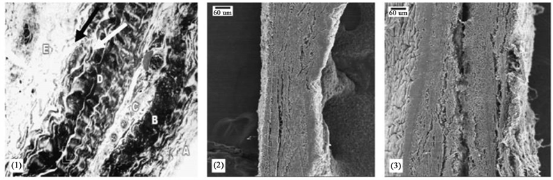 Figure 7. Original description: Light microscopy (100×)—VAD patient pericardium, with pericardial sac on right. Five (instead of the normal three) layers are identifiable: (A) mesothelial, (B) internal fibrosa, (C) loose tissue, (D) external fibrosa, and (E) epipericardium. The loose tissue is rich in vessels. No inflammatory cellularity was identified in any of the five layers. In both fibrous layers, wavy collagen bundles are visible, however the wave length of fibres in layer B (internal fibrosa) is smaller than that in layer D (external fibrosa). Taking together the increased amount of collagen bundles, in wavy, accordion-like arrangements, with different orientations in relation to each other, and with more than one elastic fibre accompanying the bundles at seemingly perpendicular angles (seen through electron microscopy, not shown), seems to suggest a pneumatic-like structure, designed to absorb abnormally large external forces. Similarly, this functional arrangement also explains why there is no diastolic dysfunction, despite the thickened pericardial walls. (2) SEM of non-VAD patient pericardium. Normal three layers are visible: mesothelium (white arrow), fibrosa (black arrow) and epipericardium. (3) SEM of VAD patient pericardium. Fibrosa has split into two halves (arrows) that sandwich a newly formed layer of loose tissue (L). Note that the scale in both (2) and (3) is the same. The wavy form of collagen bundles is a mechanically energy-efficient method to deal with the movement that the fibrosa must constantly undergo to follow the rhythm of the cardiac cycle. Similar to an accordion, collagen bundles will extend and contract in diastole and systole, respectively. However, during an episode of sudden and violent tachycardia (common in VAD patients), this rhythm can be greatly increased (up to 200 beats per minute, in a matter of seconds) and the mechanical stress imposed on the MC monolayer may threaten its structural integrity. One of the functions of the loose tissue layer must certainly be blood and nutrient supply to this much larger organ. Remarks: ultrastructure micrographs, obtained with scanning (SEM) and transmission (TEM) electron microscopy. Pericardial wall in exposed and non-exposed persons 1) exposed (Light microscopy) 2) non-exposed (SEM) and 3) exposed (SEM) [50] Alves-Pereira M., Branco C. (2007) Vibroacoustic disease: biological effects of infrasound and low-frequency noise explained by mechanotransduction cellular signalling http://www.sciencedirect.com/science/article/pii/S0079610706000927. Page 11 FIG 2. With permission.
