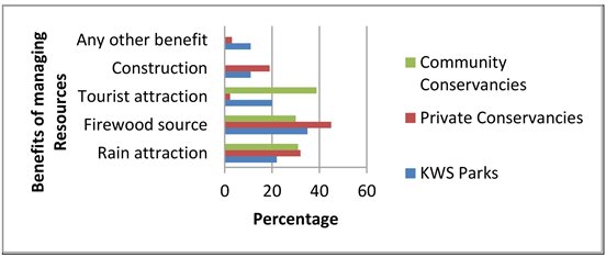 Sixty four percent (64%) of the respondents in five conservation areas were involved in conservation of resources. By conserving forests, 26% of the respondents living next to KWS parks benefitted from favourable weather, 35% of the respondents benefited from source of firewood while 20% benefitted from tourism. Forty six percent (46%) of the respondents indicated that the conservation area management involved them in decision making while 52% were not involved. Sixty seven percent (67%) of the respondents were aware of the environmental issues while 33% were not aware (Table 2). Thirty two percent (32%) and 45% of the respondents living next to private conservancies benefitted from favourable weather and firewood respectively. Thirty eight percent (38%) of the respondents living next to community conservancies benefitted from tourism. Overall, sixty two percent (62%) of the respondents living next to KWS Parks and 64% living next to private parks were not involved in decision making. Seventy nine percent (79%) of the respondents living next to community conservancies were involved in decision making.