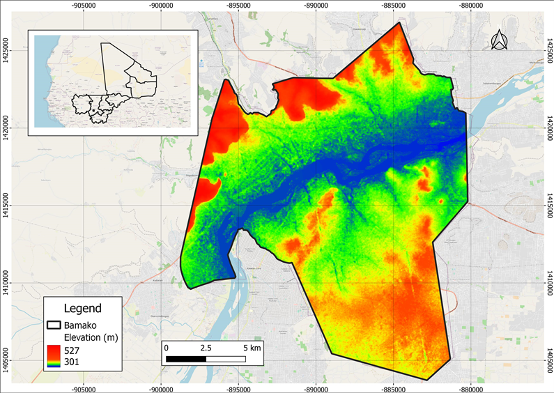 other due to lateralization and alluvial formation occupying the primary and secondary river beds and tributaries (Keita et al., 2020) . Bamako’s vegetation is largely savannah forest and rivers (Keita et al., 2020) . The topography of the Bamako area is given in Figure 2.