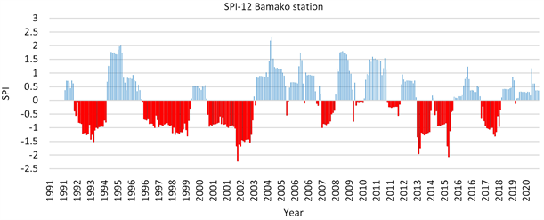 The West Africa rainfall variability is known to be influenced by the Atlantic Ocean (Hastenrath et al., 2011; Rodríguez-Fonseca et al., 2015) and the El Niño-Southern Oscillation’s (ENSO) influence on the West African Climate is considered to be linked to the region’s droughts. This was viewed to be an El Niño events’ justification which were unexpectedly recorded in the same period as the Sahelian drought in 1972-1973, 1982-1983 and 1997-1998. The El Niño effect on weather patterns also affected rainfall across the Sahel and West Africa in 2015, this could also be an explaination of the Bamako’s drought recorded in 2015.