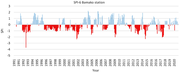 However, based on previous literature on Sahel drought, many studies argued that almost all the Sahel countries experienced extreme decadal variability in rainfall during the twentieth century with devastating drought over 1970s and 1980s (Taylor et al., 2017) . In a recent study on recent trends in the regime of extreme rainfall in the Central Sahel Panthou et al. (2014) showed that the West African Sahel was characterized by a succession of three (3) Periods of roughly equal duration: the wet Period (P1) from 1950 to 1969; a severe drought period (P2) from 1970 to 1990 and the recent period (P3) from 1991 to 2010. The droughts of the recent period P3 observed in the Central Sahel match with almost all the droughts observed in the same period in this study (Figure 6). Droughts are a common hazard in Mali, as well as the broader Sahel area (Doukoro et al., 2022) . They have led to some food emergencies in 1972-1974; 1983-1985; 2002-2003; 2011-2012 and 2015-2018 partly due to the 2015/2016 El Niño induced drought (Doukoro et al., 2022) .