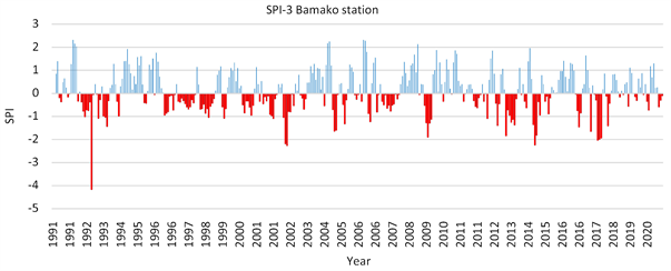 The SPI was used to identify the historical drought which occurred in Bamako during the last three (3) decades from 1991 to 2020 based on the 12-month, 6-month and 3-month SPI timescales. Drought is defined when the SPI reaches a negative value and continues progressively until it becomes positive. Positive values of SPI are defined as wet period, based on this definition, the computed SPI for 12-month timescale revealed that Bamako experienced a serious extreme drought once in 2002 (SPI = −2.2165) and 2015 (SPI = −2.0598). However, based on drought classification of SPI, nine (9) severe droughts occurred during the years 1993, 2002, 2003, 2013 and 2015; forty one (41) moderate droughts and in