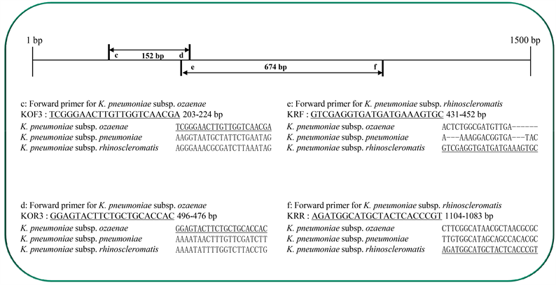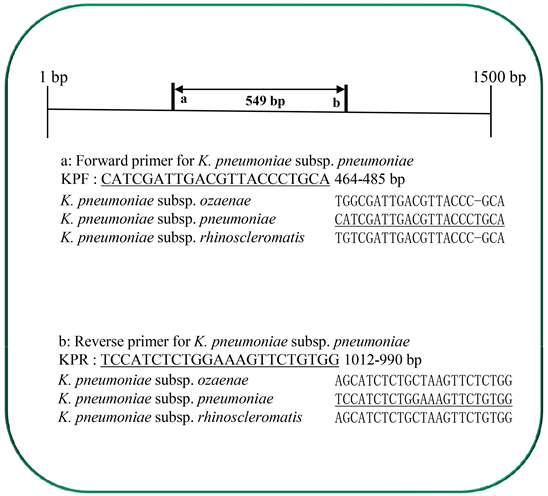 Figure 1. Species-specific primers for 16S rRNA gene of K. pneumoniae subsp. pneumoniae. The nucleotide sequence of each primer has been underlined.
