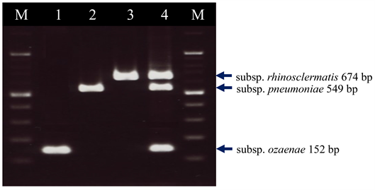 Figure 3. Multiplex PCR for Klebsiella pneumoniae subspecies level. Lane: 1: K. pneumoniae subsp. ozaenae JCM 1663; 2: K. pneumoniae subsp. pneumoniae JCM 1662; 3: K. pneumoniae subsp. rhinoscleromatis JCM 1664; 4: Mixture of K. pneumoniae subsp. ozaenae JCM 1663, K. pneumoniae subsp. pneumoniae JCM 1662 and K. pneumoniae subsp. rhinoscleromatis JCM 1664. M, molecular size marker (100 bp DNA ladder).
