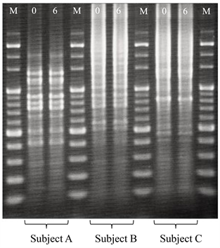 Figure 5 shows the results of genotyping by AP-PCR using OPA-7 primer of each K. pneumoniae subsp. pneumoniae isolates from subject A, B and C at 0 month and after 6 months. The AP-PCR patterns of K. pneumoniae subsp.