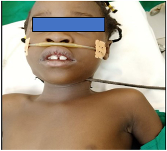 Trauma to the external, open upper airways is serious not only because of the immediate vital risk, but also because of the risk of distant functional sequelae [1] [5] . A thorough understanding of the mechanisms of injury, the warning signs and a good knowledge of the major cervical areas are essential to avoid misdiagnosing the trauma [6] [7] [8] . Our patient received a foreign body in the form of a steel bar on the anterior aspect of her neck. Her condition can be explained by violence during children’s games in a rural environment, due to a lack of supervision on the part of the parents. Asphyxia is the leading cause of death in both closed and open laryngeal trauma. Ensuring permeability of the respiratory tract should be the first step. Management of external trauma to the larynx is based on clinical examination, with nasofibroscopy cervical CT Scan and endoscopy helping to establish a diagnosis of severity and guide treatment. The multidisciplinary team decided to take rapid action, given the limited space available, the emergency situation and the anxieties of the parents. A foreign body in a child’s airways is a paediatric emergency, and one of the most frequent accidents. There are 1500 cases in France every year. In developing countries, the frequency is underestimated [9] [10] [11] . Most authors report that this accident occurs at the age of grasping, from 6 months to 3 years, with a peak around 4 years, and is predominantly male [12] [13] [14] . Our particular case involved a 7-year-old female child who, while playing with her friends, was hit in the neck by a projected steel bar. We note that foreign bodies often occur as a result of a daytime accident in a healthy child at a specific time (during a meal or a game). In 80% of cases, questioning reveals the notion of a penetration syndrome, reflecting a reflex to protect the respiratory tract. This syndrome includes vocal cord closure, laryngeal spasm, resulting in a hacking cough after a sudden attack of suffocation with cyanosis followed by dyspnea, cardiovascular and neurological signs [15] [16] . Our patient did not present with penetration syndrome or vocal cord closure, which could be explained by the particular location of the foreign body (Figure 1 and Figure 2). The presence of a foreign body in the respiratory tract leads to a false route, dyspnoea with signs of struggle, oedema and infection. An edema 0.5 cm in diameter is enough to reduce the subglottic airway by 75% [17] [18] . The nature of the foreign body varies according to the environment and eating habits. It may be organic or inorganic (fish bones, pearls, peanuts, metal, etc.) [19] . Our patient presents with a rigid metallic body made of steel. The clinical symptomatology depends on the location of the foreign body (Table 1). The examination should be brief, auscultation for bronchial rales, paraclinical radiography of the neck and lungs face and profile, blood gases and a standard work-up for endoscopy: CBC, GS/RH, TP, TCK; should be carried out within a short time, which was not done in our patient for lack of means, as the parents had a low socio-demographic level. Treatment was aimed at extracting the foreign body, to be prevented by informing the parents of the seriousness of the accident, and using visible and radio-opaque toys [20] [21] .