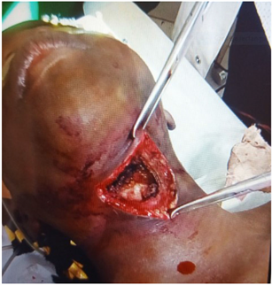 This was a 7-year-old female child weighing 19 kg, a student with no particular pathological history, up-to-date vaccinations and a low socio-demographic standard of living, who was referred to us from a regional hospital 120 km from the capital, for treatment of a cervical wound caused by a penetrating object. On arrival, the child was found to be conscious, with a clean, dry bandage around the neck, enclosing a steel rod. Conjunctival staining and hemodynamic constants were stable. There was no respiratory distress, the pulmonary, cardiac and digestive systems were normal, and there was no dysphonia. However, there was odynophagia accompanied by a swallowing disorder marked by hypersalivation, and pharyngeal and tracheobronchial congestion. There was no cough or hemoptysis (bloody sputum). The oropharynx was unremarkable. Hypopharyngoscopy revealed blood clots and a transverse steel foreign body that could not be removed directly. As soon as we received the patient, we immediately called the pediatric intensive care unit, the Ent department and the head and neck surgery department, and took the child to the ENT department. Once the dressing had been removed, we saw a steel iron rod some 50 cm long frozen in the neck, with a portal of entry located in the upper left lateral third, the tip of which threatened under the right horizontal ramus of the mandible with an oblique upward trajectory. X-rays and cervical CT scans were not performed, due to a lack of operational service. We opted for a safer cervicotomy to remove the foreign body.