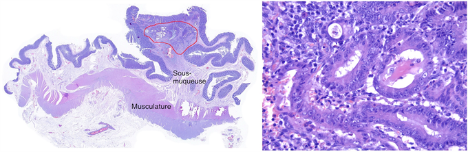 Figure 4. (a) Surgical specimen of a left colectomy with an ulcerating-bourging lesion; (b) Macroscopic appearance of an ulcerating lesion (in red); (c) In red, the area of sub mucosal infiltration, tumoral colonic glands.