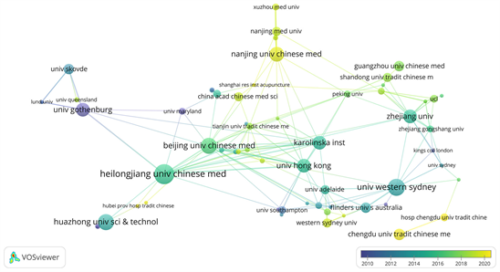 Among the 345 nodes and 557 links, Heilongjiang University Chinese Med (n = 16) ranked first in publication volume, followed by Korea Institute Oriental Med (n = 14) and Huangzhong University of Science & Technology (n = 12). In terms of centrality, the top three institutions were Beijing University Chinese Med (0.09), Karolinska Institute (0.06) and Heilongjiang University Chinese Med (0.05) (Figure 3(a), Table 4). Visual analysis (Figure 3(b), Figure 3(d)) was performed by VOSviewer. Karolinska Institute was the most cited institution (n = 372), followed by Heilongjiang University Chinese Med (n = 300) and University Adelaide (n = 292). In the knowledge map analyzed by the co-authors, red clustering showed that there was a close cooperative relationship among Yale University, Karolinska Institute, Gossberg University, Heilongjiang University of Chinese Medicine and University of Hong Kong. Blue clustering revealed cooperation among Shanghai University of Traditional Chinese Medicine, Nanjing University of Traditional Chinese Medicine, Guangzhou University of Traditional Chinese Medicine, Xuzhou Medical University and Nanjing Medical University, while green clustering illustrated the cooperative relationship among Beijing University of Traditional Chinese Medicine, West Sydney University and University of New South Wales. Purple clustering showed cooperation among Kyunghee University and Korea Institute of Oriental. Yellow clustering indicated cooperation among Zhejiang University of Traditional Chinese Medicine, Shandong University of Traditional Chinese Medicine and Peking University. (Figure 3(c)). West Sydney University, Heilongjiang University of Chinese Medicine, Nanjing University of Traditional Chinese Medicine and Zhejiang University were the core members of the cooperative network, promoting extensive cooperation among many institutions.