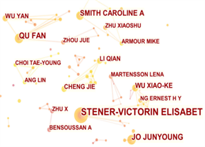 461 authors who have published articles of acupuncture and moxibustion in the treatment of infertility were searched and analyzed. CiteSpace was used to analyze the author’s collaboration network and centrality (Figure 4(a)), and VOSviewer