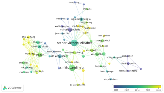 was utilized to analyze the author’s overlay visualization and collaboration network (Figures 4(b)-(d)). The top three authors of cited frequency were Stener-Victorin E (n = 493), Norman Robert J (n = 235), Sterzik, K (n = 178). Stener-Victorin E published the highest number of articles (n = 13, Table 5). Among the co-cited authors, Stener-Victorin E (n = 287) ranked first, followed by Caroline A. Smith (n = 157) and Manheimer E (96). The top three authors of centrality were Stener-Victorin E (0.15), Bae CS (0.11) and Caroline A. Smith (0.11), as shown in Table 6.