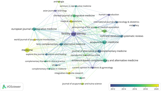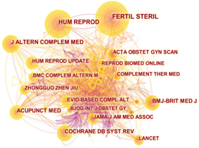 In this study, a large number of journals show that the efficacy of acupuncture in the treatment of infertility is receiving widespread attention. The average impact factor of the top ten journals is 4.2665. The top ten journals have published 129 articles, accounting for 39.21% of the total. Fertility and Sterility (IF: 7.329) focuses on the field of reproductive medicine. It is worth noting that Fertility and Sterility ranks first in terms of publication, citation and co-citation, indicating that the journal plays a key role in this field. In addition, three of the top 10 journals belong to complementary and alternative medicine, namely Journal of Alternative and Complementary Medicine, Evidence Based Complementary and Alternative Medicine and BMC Complementary and Alternative Medicine. A total of 32 articles have been published, accounting for 24.8% of the total number of articles published in the top 10 journals, indicating that more and more attention has been paid to the efficacy of complementary and alternative medicine in the treatment of infertility from 2000 to 2021. In the cooperative network, Fertility and Sterility and Human Reproduction Update have the highest correlation, indicating that there is a close cooperative relationship between these two journals in the research on acupuncture treatment of infertility.